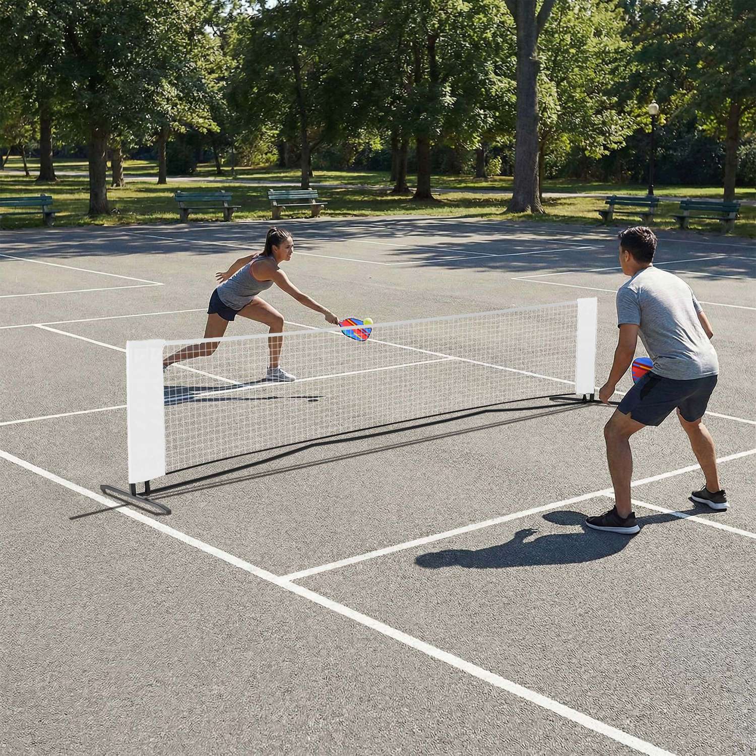 • Game includes two paddles, two outdoor balls, steel poles and net