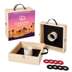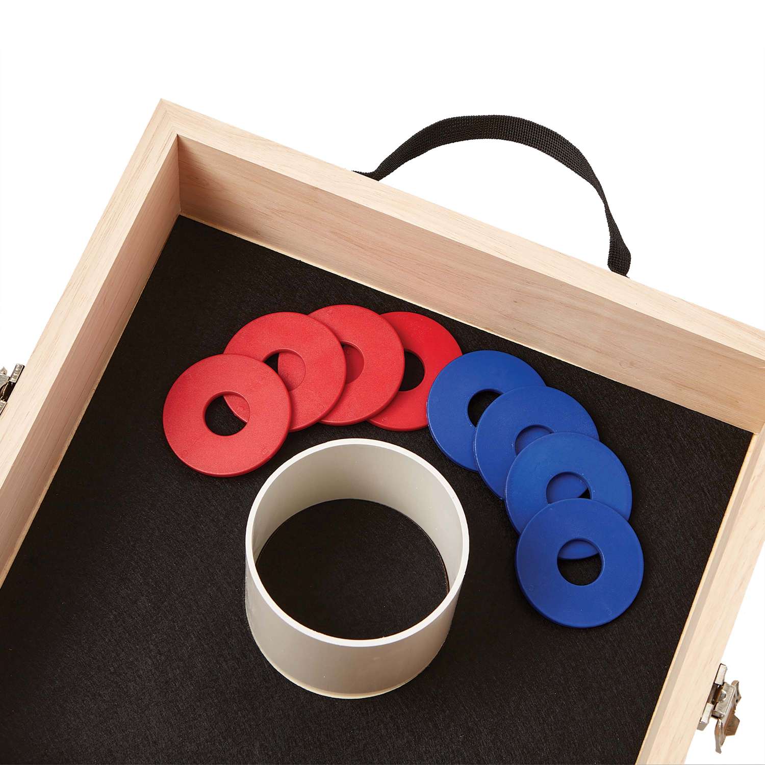 • Game includes wood case that separates into two halves and eight washers