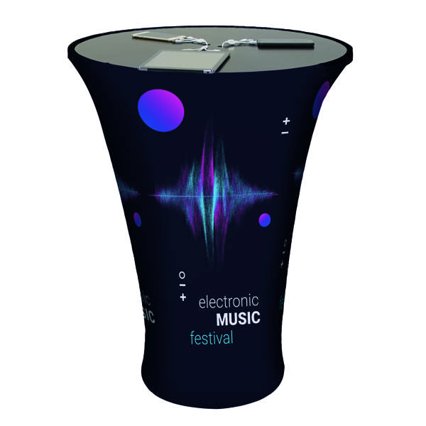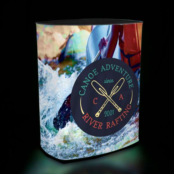 This kit converts an oval hard case into a podium. It includes a graphic wrap and an oval countertop.