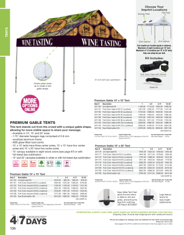 One imprint per location (peak or valance). Maximum of eight locations per 10' tent; Maximum of 12 locations per 15' & 20' tents. Only one setup fee per tent.