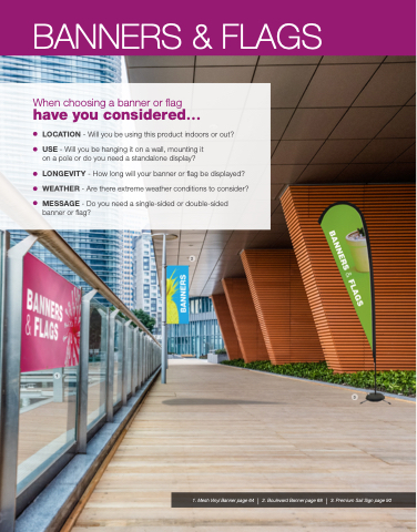 1. Mesh Vinyl Banner page 64 | 2. Boulevard Banner page 68 | 3. Premium Sail Sign page 90