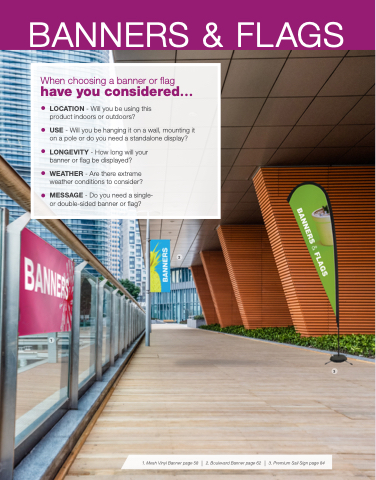 1. Mesh Vinyl Banner page 58 | 2. Boulevard Banner page 62 | 3. Premium Sail Sign page 84